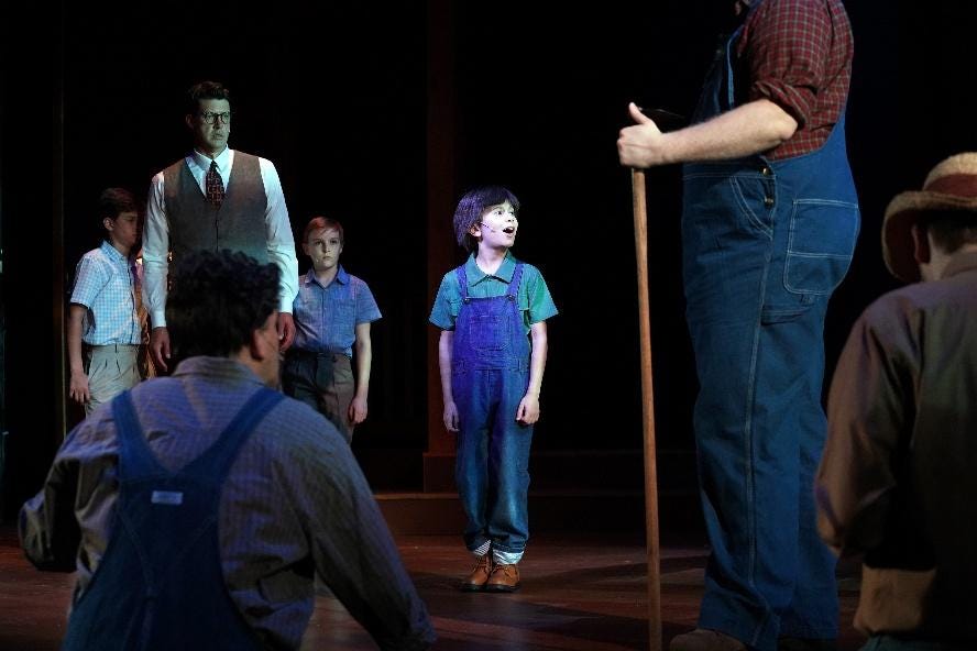 The ensemble was well-cast and very well suited to their roles. Two regulars whom I have seen multiple times in casts outdid themselves, seeming to find in their roles a believable solidity and a deep emotional connection: Ian Lane as Heck Tate and Stephanie Wood as the highly opinionated Stephanie Crawford. Additionally, the child ensemble of Elani Roza Yanex, Grayson Lewis, Mathias Glick as respectively the Finch children and neighbor Dill work well together and share a very comical set of moments with Ashlee James as Calpurnia.