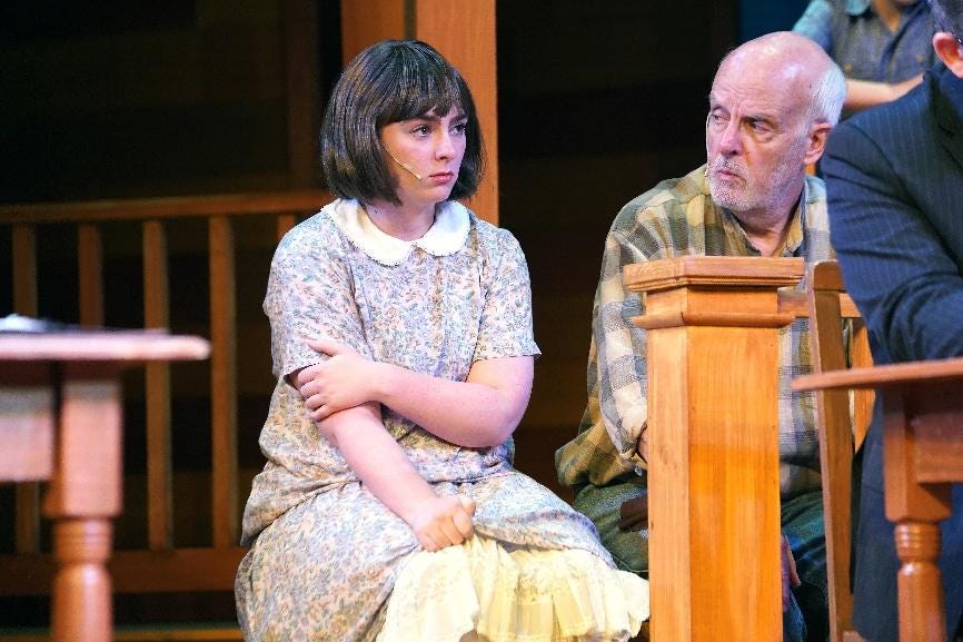 Tom is accused by Mayella Ewell (Sarah Stewart) and her father Bob (William Johnson), both of whom remain human in their characters which express personified prejudice. Their entitled rage shows in their determination to use a broken system to exact revenge on the world.