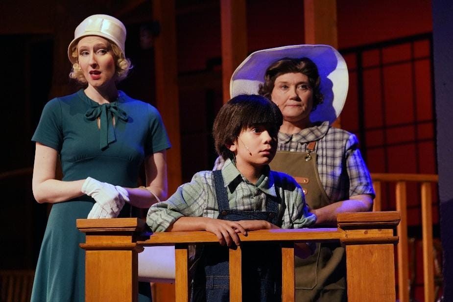 The production supports the action of the play truly well. As I mentioned before, the costumes are accurate for the characters and evoke a feeling of nostalgia: they are accurate to the 1935 time period of the show. They are also in some way timeless and perfect for the characters wearing them. The cut and fit were impeccable (other than what seemed to be a slippery wig). Seeing a pair of shorts on a small boy with pant legs three times the girth of his legs sent me into midcentury flashbacks of mid-century childhood.