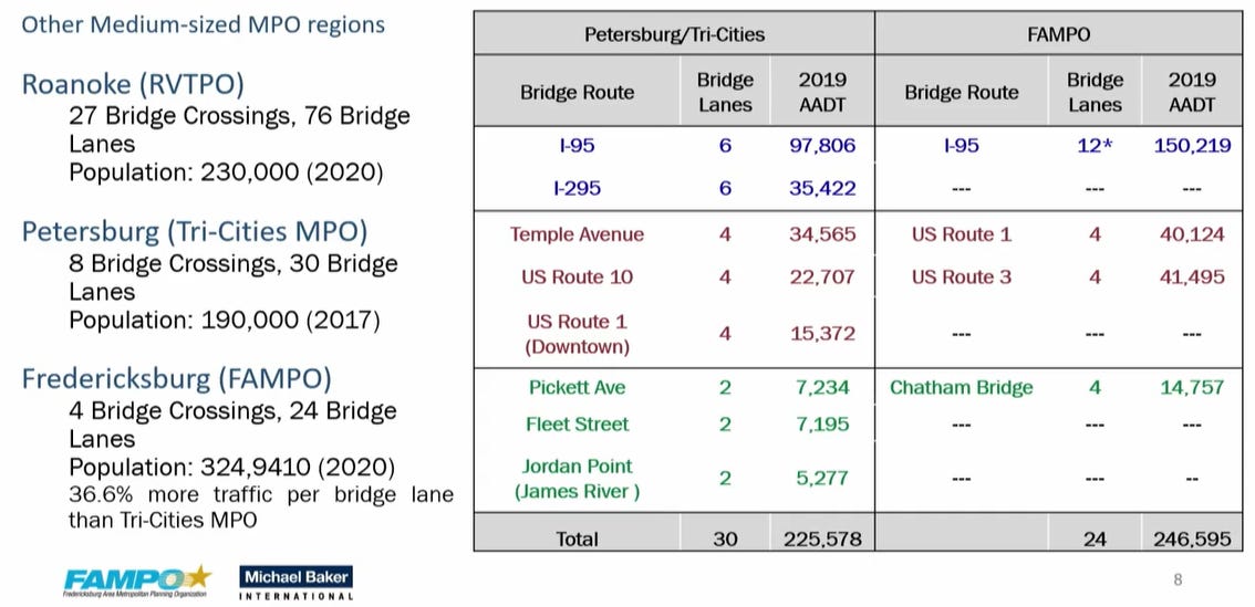 The seriousness of the situation was best characterized by Ian Ollis, the Fredericksburg Area Metropolitan Planning Organization director, who presented a slide comparing the number of river crossings in Virginia cities of similar size.