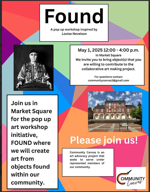 Community Canvas, a local art advocacy project, will host “Found,” a pop-up arts workshop from 12 to 4 p.m. on Thursday, May 1. The end result of the workshop will be a large-scale, three-dimensional collage of found objects representing the entire community.
