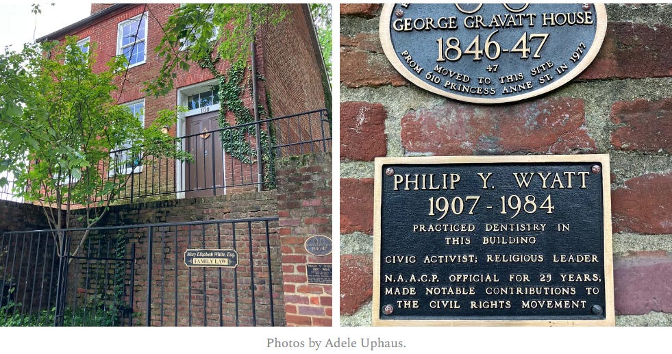 This building, associated with local dentist and civil rights leader Phillip Wyatt, was moved to this location from Princess Anne Street in 1977.