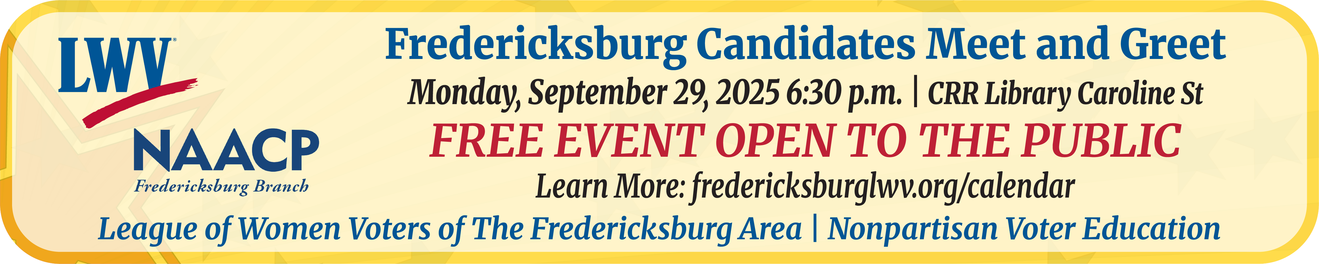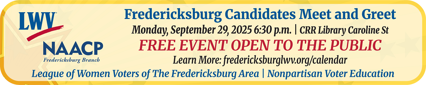 It's Tuesday, September 23, 2025. Today, previews of the Stafford BOS and the Fredericksburg City Council meetings, candidates respond to Sierra Club, and city School Board finds Ward 3 replacement.