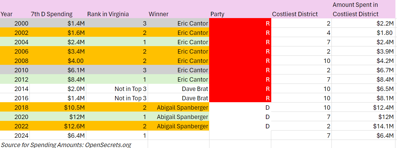 The congressional seat for Virginia District 7 has always been among the most expensive in the commonwealth, but the cost has exploded in recent years. In 2024, the cost is likely going to rise again.