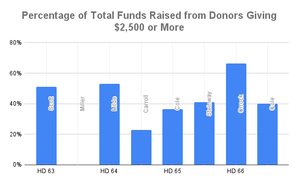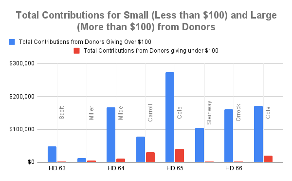 The only possible exception is Forrest Miller’s campaign in HD 65, where the gap between larger and smaller donors is not as notable.
