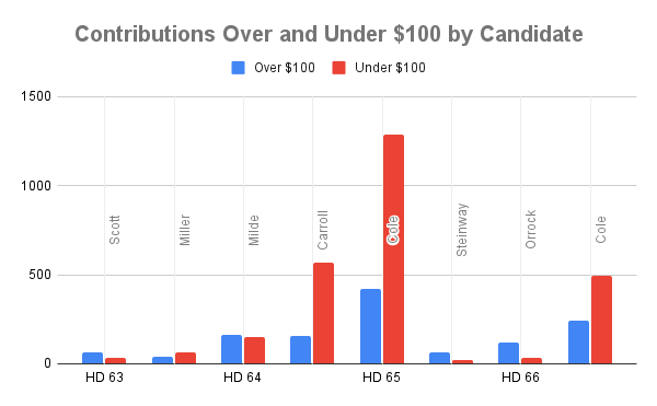 Josh Cole in HD 65 leads all candidates with 1,286 contributions from small-dollar donors. Stacie Annie Carroll in HD 64 is second with 565 contributions.