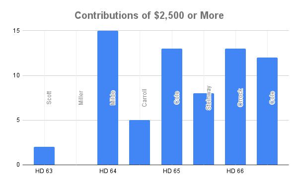 Consider that as a percentage of total contributions raised, Scott, Milde, and Orrock — all Republicans — are, for the moment, most dependent on those larger dollars. Of the three, however, Scott may be the most vulnerable.