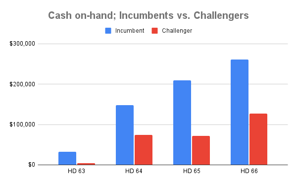 As the candidates for races in House districts 63, 64, 65, and 66 prepare to push their campaigns into overdrive this September, the money count shows can help us understand who has the advantage in early voting, for example, which begins September 19.