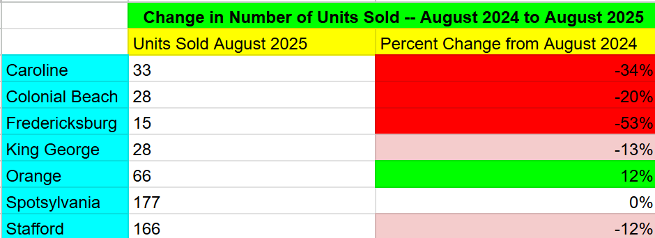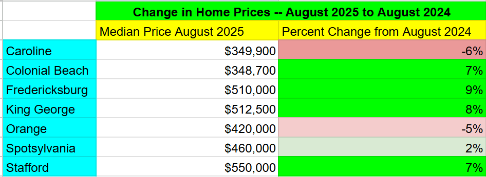 Across the region that the FAAR report covers (Caroline, Colonial Beach, Fredericksburg, King George, Orange, Spotsylvania, and Stafford) prices for homes are up a modest 5% when comparing August 2024 to August 2025. Helping this relatively modest jump is a gradual decline in mortgage interest rates.