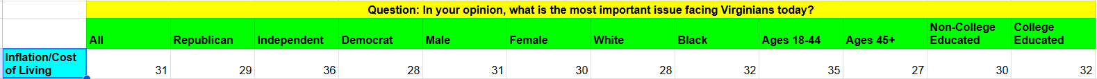 Whether looked at through the lens of political parties, gender, race, or education level, Virginians are fully in agreement that inflation and the cost of living are the most pressing issues they face.