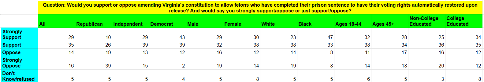 For example, when 55% of people say they support of strongly support restoring voting rights for felons who have served their time, the actual number could be as low 50.6%, or as high as 59.4%.