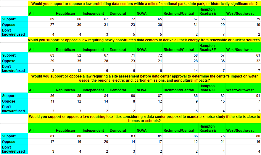 There is substantial agreement across party lines for restrictions on data center growth and development in Virginia. The poll asked four questions related to data center development, and in each case there was strong support regardless of political party or region of the state.