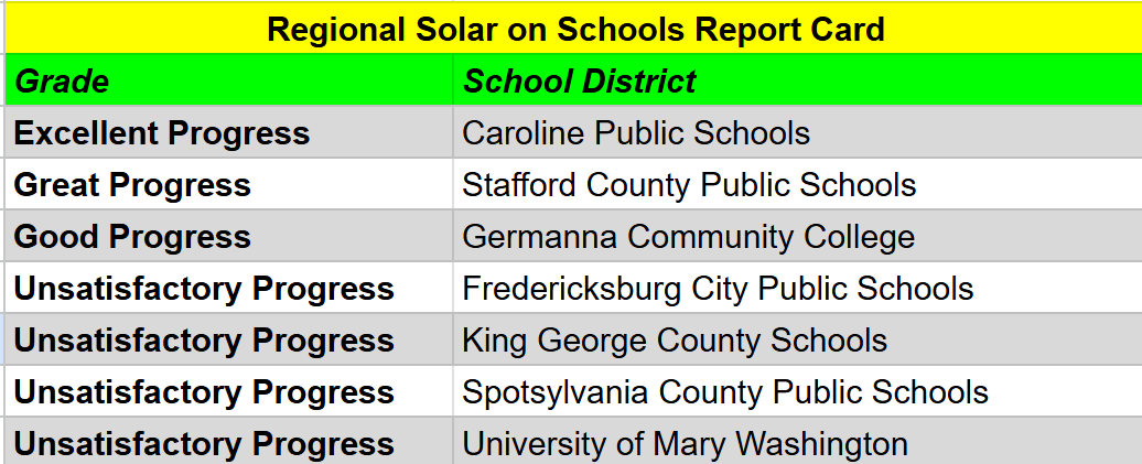 Stafford County is also making terrific progress. While it only has solar panels on one school, North Stafford High, it is the biggest single school rooftop solar project in the state. This PPA is expected to save the county $2.8 million on its electricity bills over the 25-year contract period. It will prevent as much carbon from being released into the atmosphere as removing the equivalent of 42,000 cars from the road.