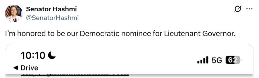 Ghazala Hashmi declared victory in her bid to become the Democratic nominee for Lt. Governor shortly after 10 p.m. She holds an advantage of nearly 3,600 votes over her closest competitor, former Richmond mayor Levar Stoney, as of 10:20 p.m. However, as of 10:20 p.m. neither the Washington Post nor the New York Times has called the race.