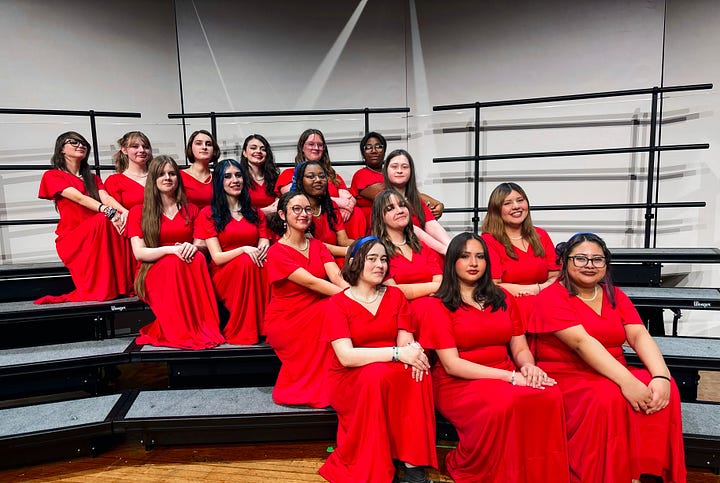 As part of its focus on community outreach, the Chamber Chorale invites a local high school ensemble to rehearse and perform with the group at each spring concert. This year’s concert includes Spotsylvania High School premier treble ensemble ‘The Knightingales,” directed by Faith Roberts.