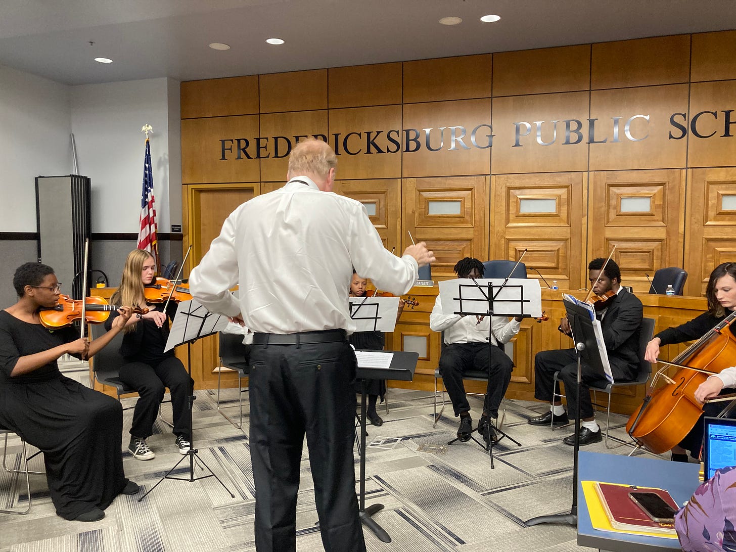 Last month, Balmages conducted the James Monroe High School advanced orchestra and the Fredericksburg Symphony in the world premiere of “Ode to a Joyride.” The students performed the piece again at the division strings concert and for the third time in its history for the School Board on Monday.