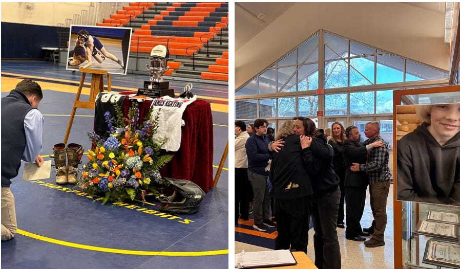 When it was his turn to speak, Orange County’s head wrestling coach, Bryan Seal, described a competitive, promising young wrestler who had placed second in a club championship a year ago and third in a recent middle school conference championship. “As you can tell, James was driven, accomplished and rising as an athlete and all-around young man.” He said that in the boy’s memory, “it is our plan to host next year's annual middle school tournament in James’ honor, making the event the James Keating Memorial and hosting an awareness campaign on suicide.”