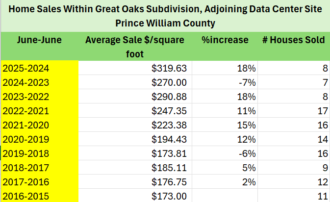 What the Cushman Wakefield study doesn’t explain is why average home sales climbed 18% from June 2024 to June 2025, or dropped 7% over the same period in 2023 to 2024. Given that the sample size is so small, the drop could be due to the particular houses that were sold — perhaps they were older or had other issues. It’s also possible that the extensive coverage of the data center issue during this time temporarily suppressed prices in the subdivision.