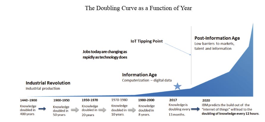 In the middle ages, knowledge doubled roughly every 400 years. By 1900, it was doubling every 50 years.