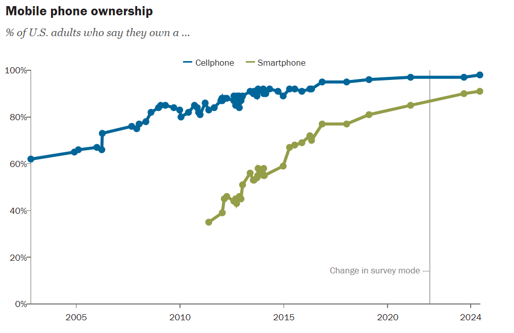 Smart phone growth has been rapid. According to Pew Research, 98% of Americans now have smart phones. That’s up from just 35% in 2011.