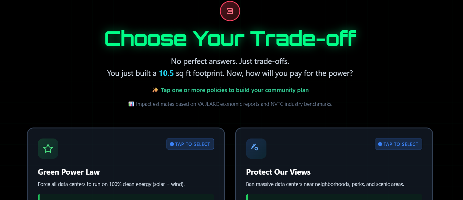 Choosing three policy options (Requiring data centers to run on 100% renewable energy, banning data centers near neighborhoods and parks, and requiring data centers to build their own roads and power lines) changes my profile markedly.