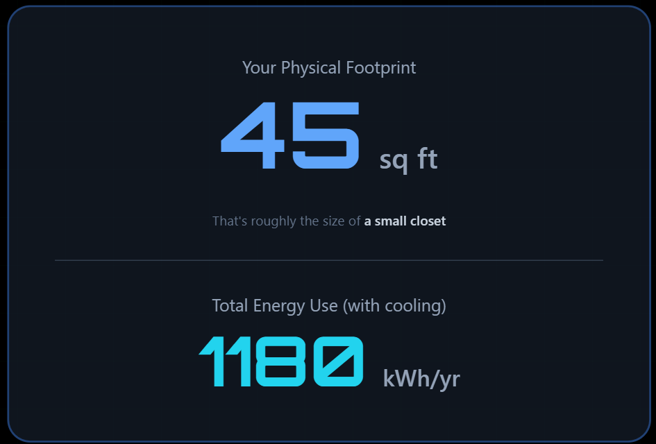 From your answers, you’ll discover the amount of data center square footage required to run your digital life, as well as the total energy use required (including cooling). Finally, you’ll see your digital life’s impact on the energy grid.