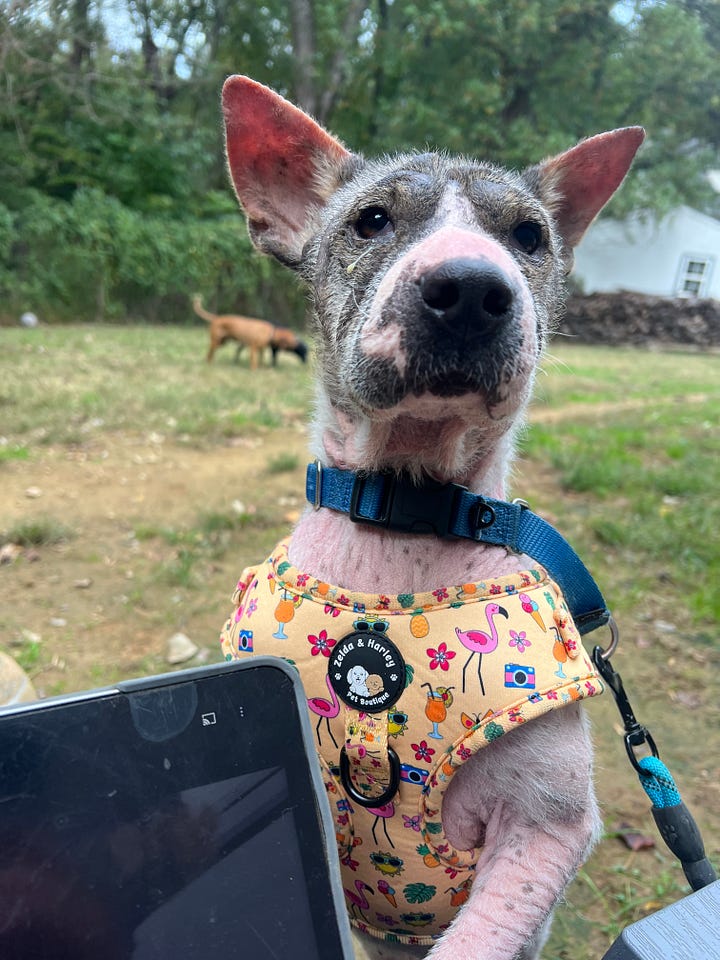 “When I started fostering Monet, she’d cower in the back of her crate,” said Christina Twombly in the press release. “She’s slowly opening up to the point she’ll now put herself right in the chaos of my pack of dogs… She still has a long way to go, but she’s learning that most humans are actually really nice.”