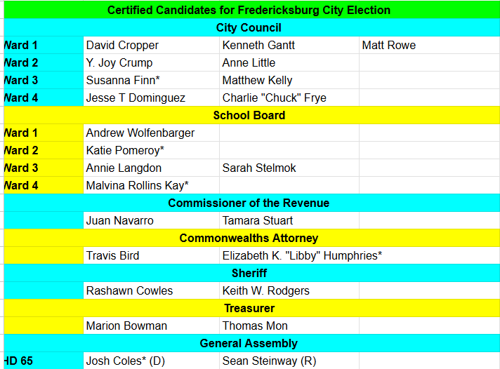 There is one House of Delegates race in Fredericksburg—HD 65. It will feature a match up between the incumbent, Josh Cole (D) and Sean Steinway (R).