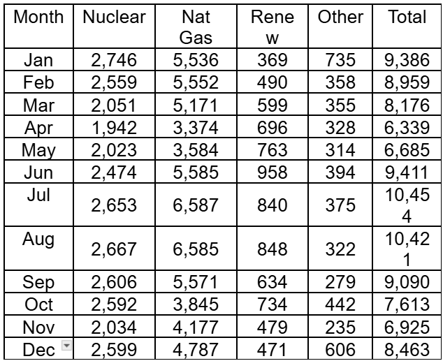 About half of Virginia’s electricity is generated by natural gas, but I cannot find a further breakdown between CC and non-CC generation. Dominion’s information on power plants shows they have 4,448 Mega-Watts (MW) of CC turbines and 2,392 MW of non-CC turbines. So, about one-third of their gas generation has the highest operating cost. Here is a chart of Virginia’s 2024 monthly generation by fuel type: