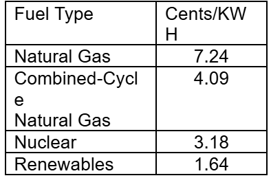 The US Energy Information Administration has published average costs for the various types of generation. Here are the operating costs (in cents per Kilo-Watt Hour) for the four largest types used in Virginia: