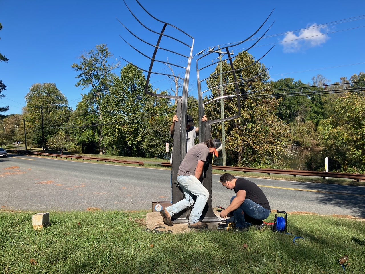 On Friday morning, Thayer; FAC Chair Kelley Drake; Commissioner Larry Hinkle; and staff from the city’s parks and recreation department were at the corner of Fall Hill Avenue and Village Lane to meet Maryland-based artist Davide Prete and help him install his 400-pound, 11-foot tall forged steel sculpture Icarus.