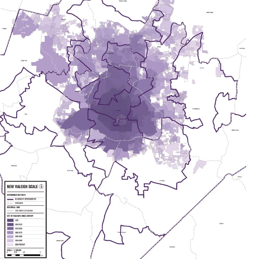Compare this with neighboring states like North Carolina where cities routinely expand into surrounding counties as the need arises. (See the growth of Raleigh, North Carolina, below from the late 18th century to now.)