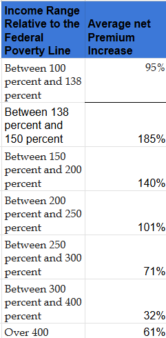 For individuals or families between 100% and 138% for the federal poverty line, that means their premiums will jump $35 a month, to $76. Roughly 52,000 Virginians fall into this category with an average household income of just under $25,000.