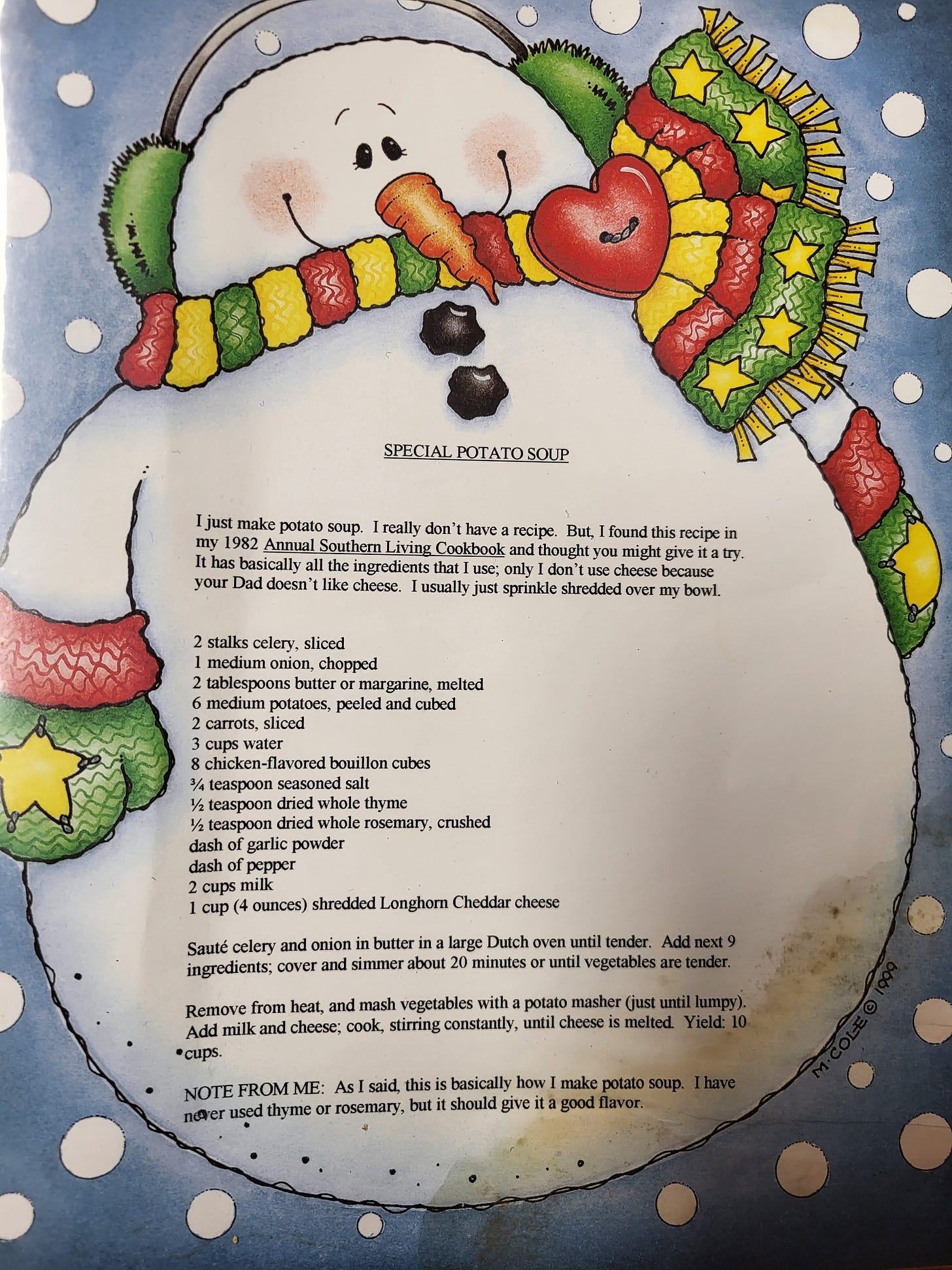 The recipes are classic comfort food, like my mom’s recipe for potato soup - still a favorite on cold weekend days and long winter nights.
