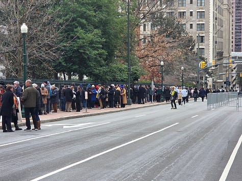 The lines were long, and the streets were empty early Saturday morning as people prepared for the day.