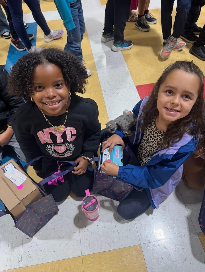 On Thursday morning, Lafayette students gathered by grade level groups in the cafeteria to get hyped up for their new shoes by principal Jacinta Calzada-Mayronne, the Lafayette Lion, the GEICO Gecko, GEICO employee volunteers, and volunteers with Delta Sigma Theta Sorority—which participated in the event by giving out toothbrushes and toothpaste.