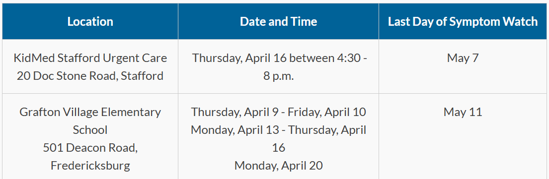 The VDH is alerting the public to possible exposure sites and timeframes, which are identified in the chart below.