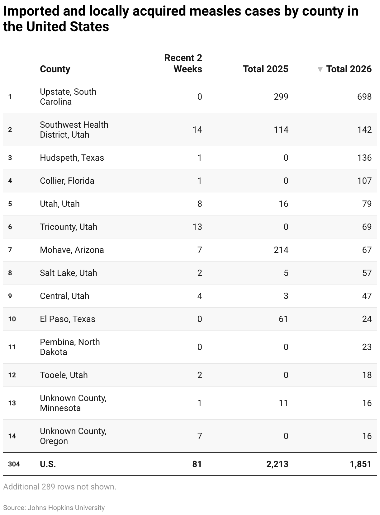 In 2025, the United states experienced the largest number of measles cases since 2019. This year, infections are well above the rate experienced this time last year according to data collected by the Johns Hopkins Bloomberg School of Public Health. (Nota bene: The Advance has historically looked to the Centers for Disease Control for this data, however, due to changes at the organization the Advance has chosen to look instead to Johns Hopkins.)