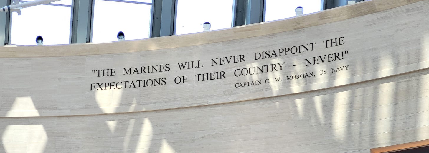 Entering the National Museum of the Marine Corps on Sunday, where the words defining the Marine Corps are engraved, my wife and I were greeted by an older gentleman who invited us to scan a QR code to access a map of the museum. He then asked a simple question: “Did you serve?”