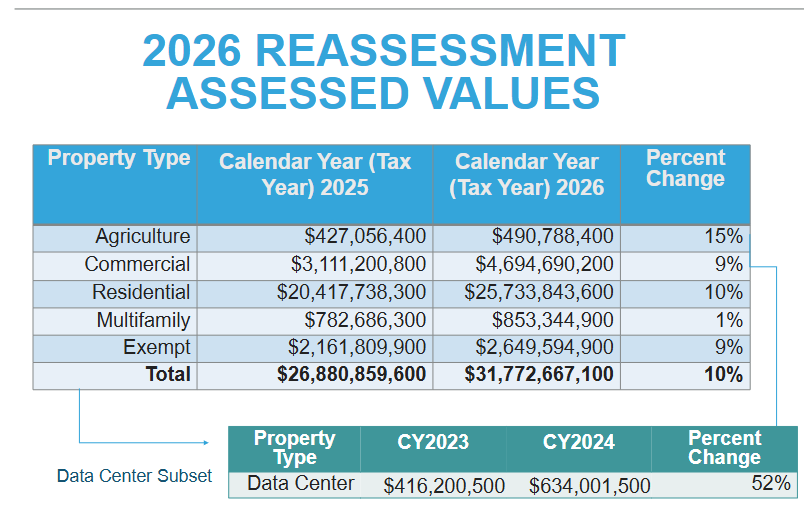 The number to watch, however, is the commercial values. Up 9% year-over-year to $4.7 million, that growth is driven overwhelmingly by data center tax revenues. As they continue to build out in the county, it will make a significant difference not just in how much money the county has to play with, but with the tax burden that citizens will have to carry.