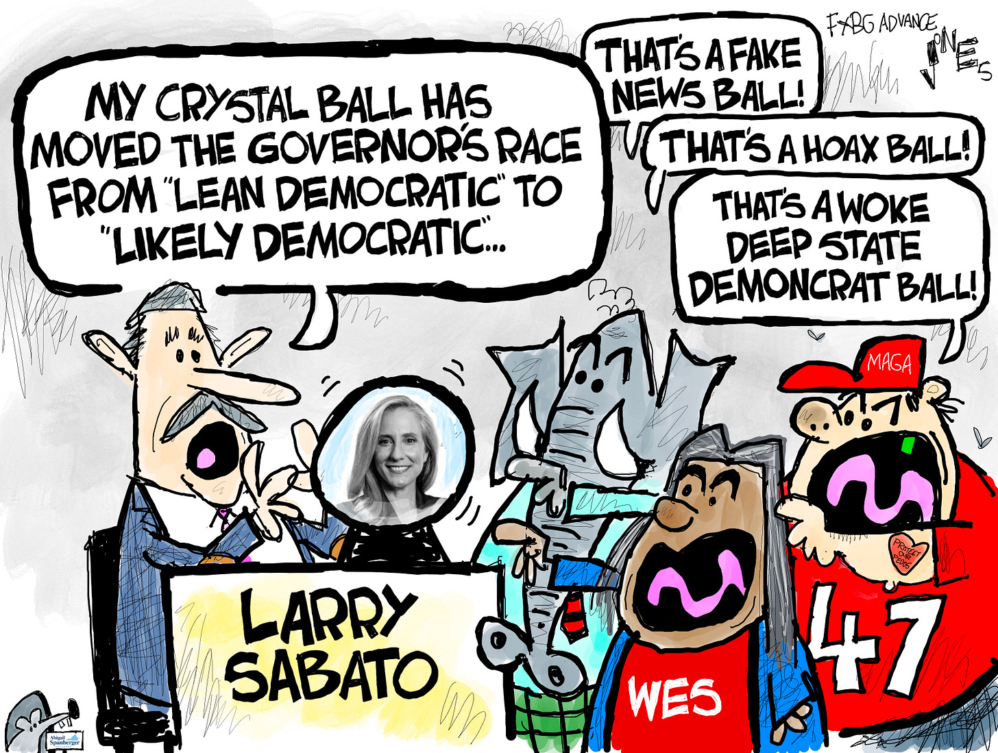 The races for Lt. Governor and Attorney General are tightening, but the race for governor in Virginia as we head into early voting — it begins September 19 — looks about as one-sided as a governor’s race in Virginia is likely to get in the current political environment. Abigail Spanberger has consistently been at least 5 points ahead of her Republican opponent, Winsome Earle-Sears, in every poll to this point. No one is suggesting landslide-like numbers of Spanberger (even Mark Robinson polled 40% in the North Carolina gubernatorial election in 2024 — and candidates don’t get much worse than Robinson), but this is her race to lose. When numbers don’t go Republicans’ way these days, how do they respond? Blame the messenger. Clay Jones has noticed.