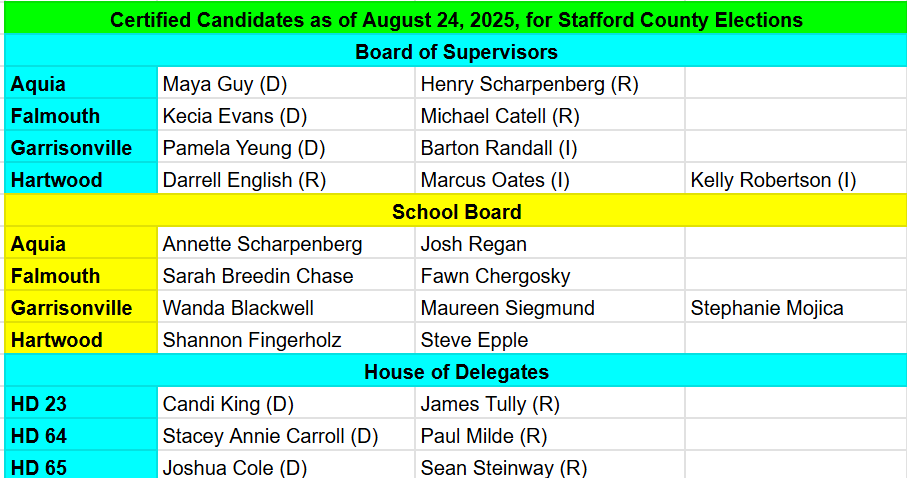 The Aquia race features incumbent Monica Gary, an independent, seeking her second term on the Board. She was elected in 2021, beating Paul Milde; she ran for Senate District 27 in 2023, losing to Tara Durant. Gary announced in December she would not be seeking re-election, but had a change of heart in February.