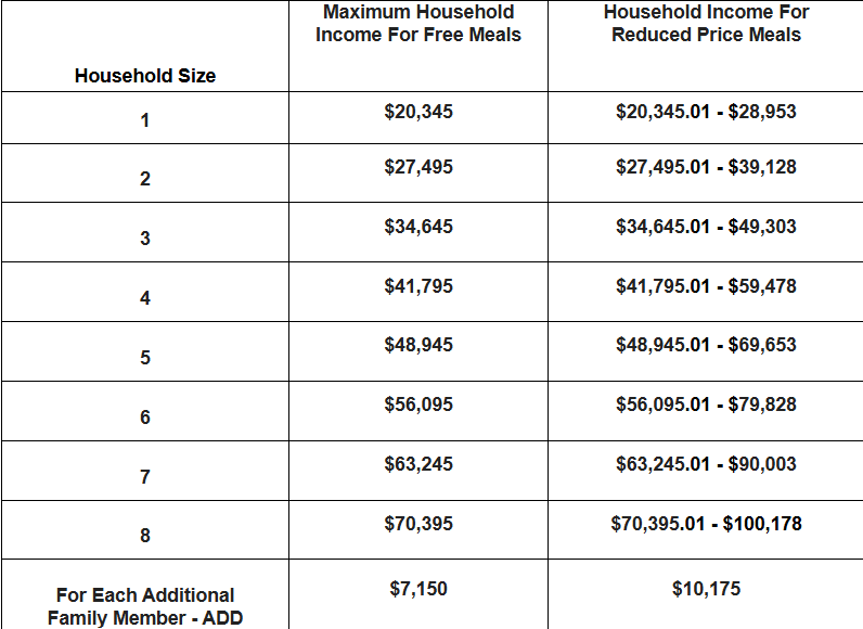 Children who are members of households with income at or below the federal income eligibility guidelines, shown in the chart below, may be eligible for either free or reduced-price meals.