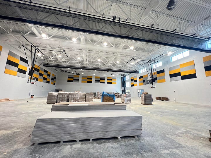 The academic core of the new school consists of two wings, each three stories tall. The main gym already boasts acoustic panels painted black, silver, and gold, which the School Board chose in August to be the new high school’s colors.