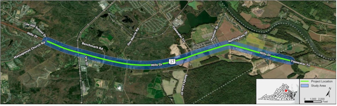 The Virginia Department of Transportation is doing a study along the Route 17 corridor in Spotsylvania between Massaponax Church Road and the Caroline county line. Much of the focus will be on intersections, where bicycle and transit access will also be reviewed.