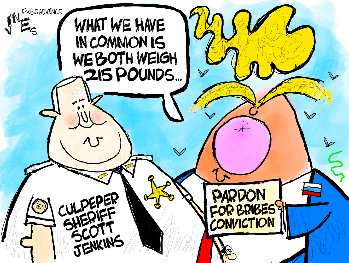 We don’t cover Culpeper here at the Advance, so when Clay Jones suggested having some fun with Trump pardoning former Culpeper Sheriff Scott Jenkins, of course we said “Yes!” According to NBC News 4, “Federal prosecutors said Jenkins took more than $75,000 in bribes from people he made auxiliary deputies, claiming their badges would allow them to carry concealed weapons in all 50 states. Donors said they also wanted the badges to help them get out of speeding tickets. Jenkins’ defense said the funds were legal campaign contributions and a “provocative” and “creative response” to defending gun rights by building up the auxiliary program.” As we say in journalism, sometimes, the stories just write themselves. Or, in this case, draw themselves.