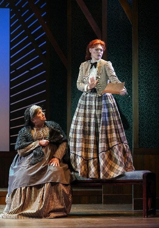 The family does not exist in a social vacuum. Support comes in the form of Mr. Laurence (Ian Lane). He’s a gruff and disapproving friend of Mr. March who provides for the extreme needs of the family. Also contributing is Aunt March (Andrea Kahane) who visits frequently, also to mostly disapprove. Her dearest desire is that Jo will become a bit less of a free spirit and more socially acceptable, and she’s willing to pay for it. Knowing Jo as we do by this point in the show we can guess the answer will be no. Kahane is wonderfully regal in performance, gliding inexorably across the stage-and she’s just as effective as Mrs. Kirk, Jo’s landlady.