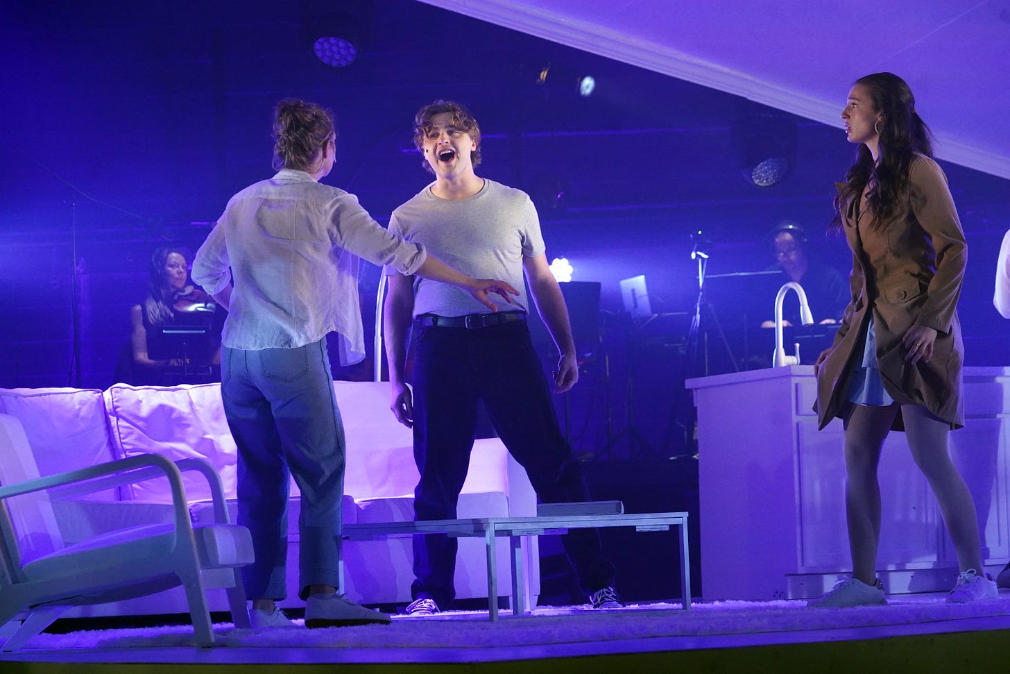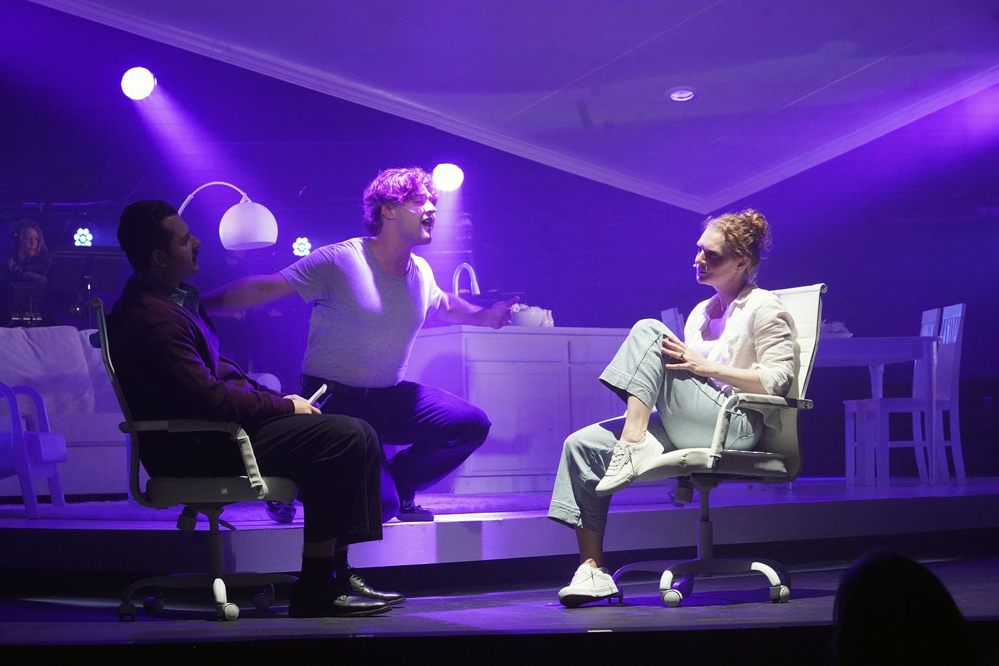 Your first impression is of the set as you enter the space. You’ll see a kitchen upstage with a counter, sink, and kitchen table. It’s set up for four people. There’s a very long comfy sofa on stage right. The furniture and objects are a stark white. Above is hanging a large tilted and angled rectangular panel, whose shape and position echo the shape and position of the floor plan for the production. In it, there are can lights as you’d see in a modern room ceiling, apparently made of acoustical panels.