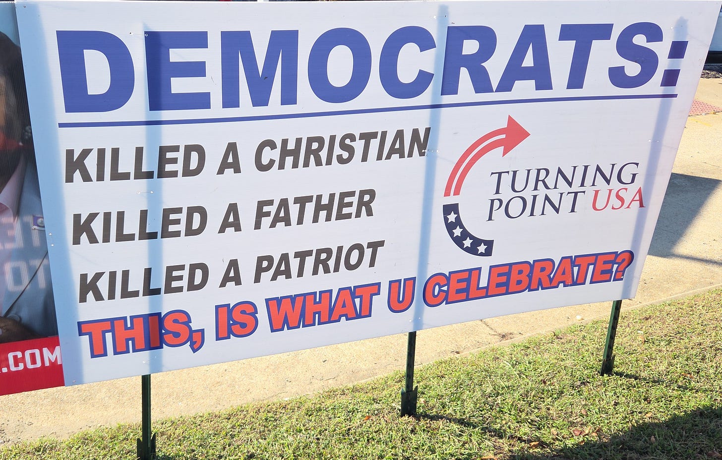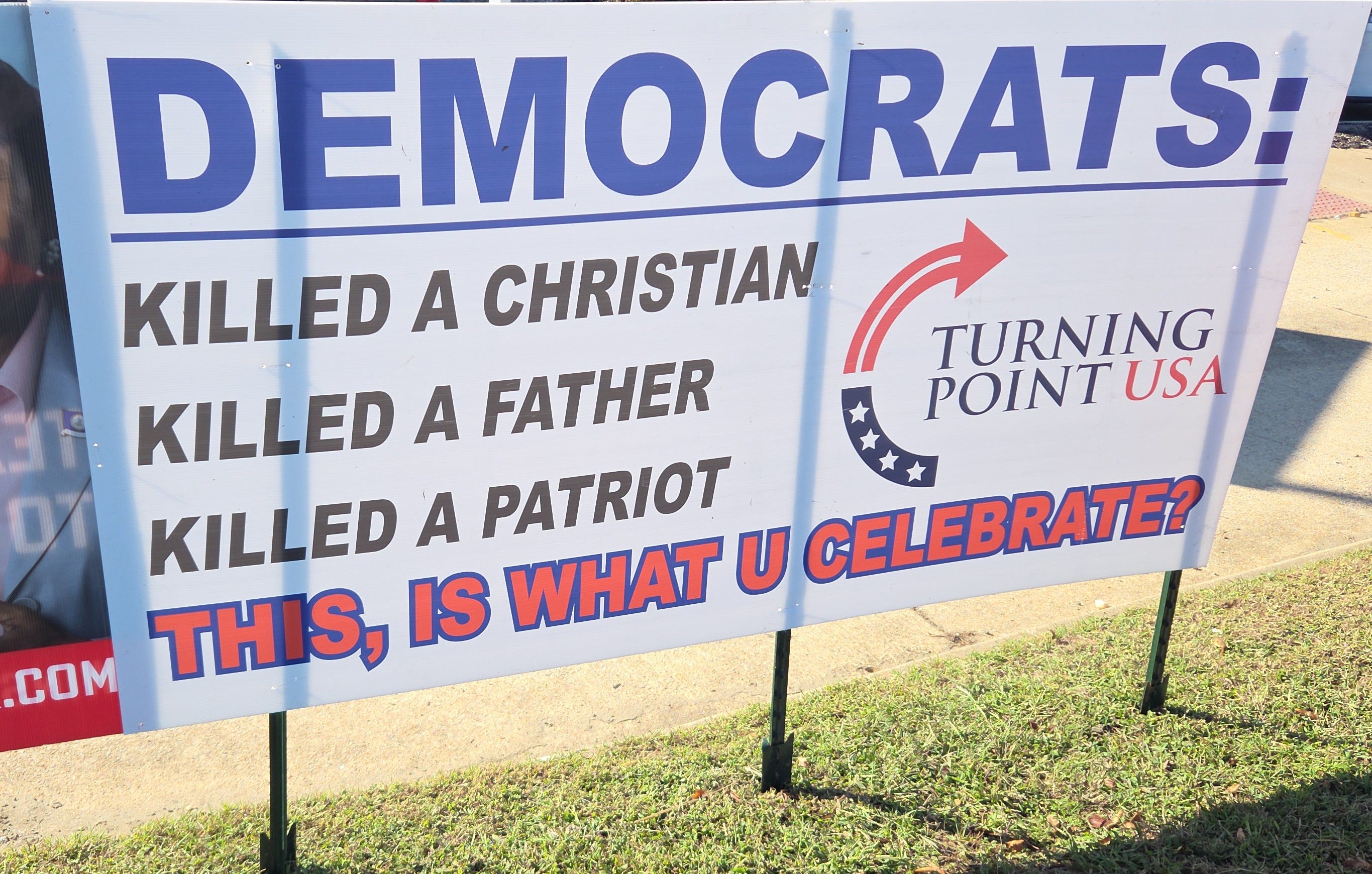 The sign carried the Turning Point USA logo, which is the organization founded by Charlie Kirk and Bill Montgomery that has for more than a decade advocated for conservative political positions on college campuses.