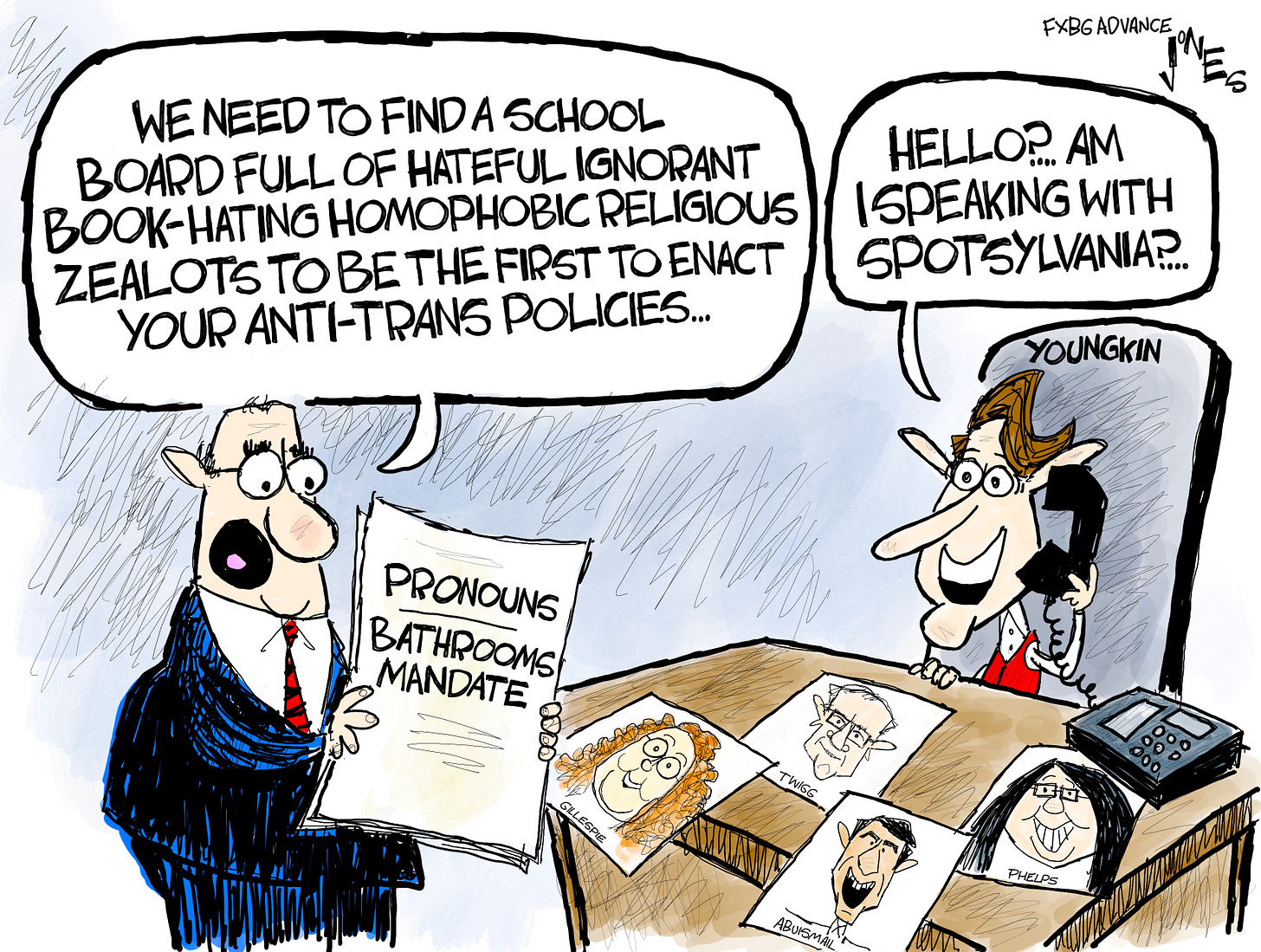 Loved this cartoon! Your likenesses of Spotsylvania's TP 4 is "spot-on!" Very good likeness of Youngkin, too!